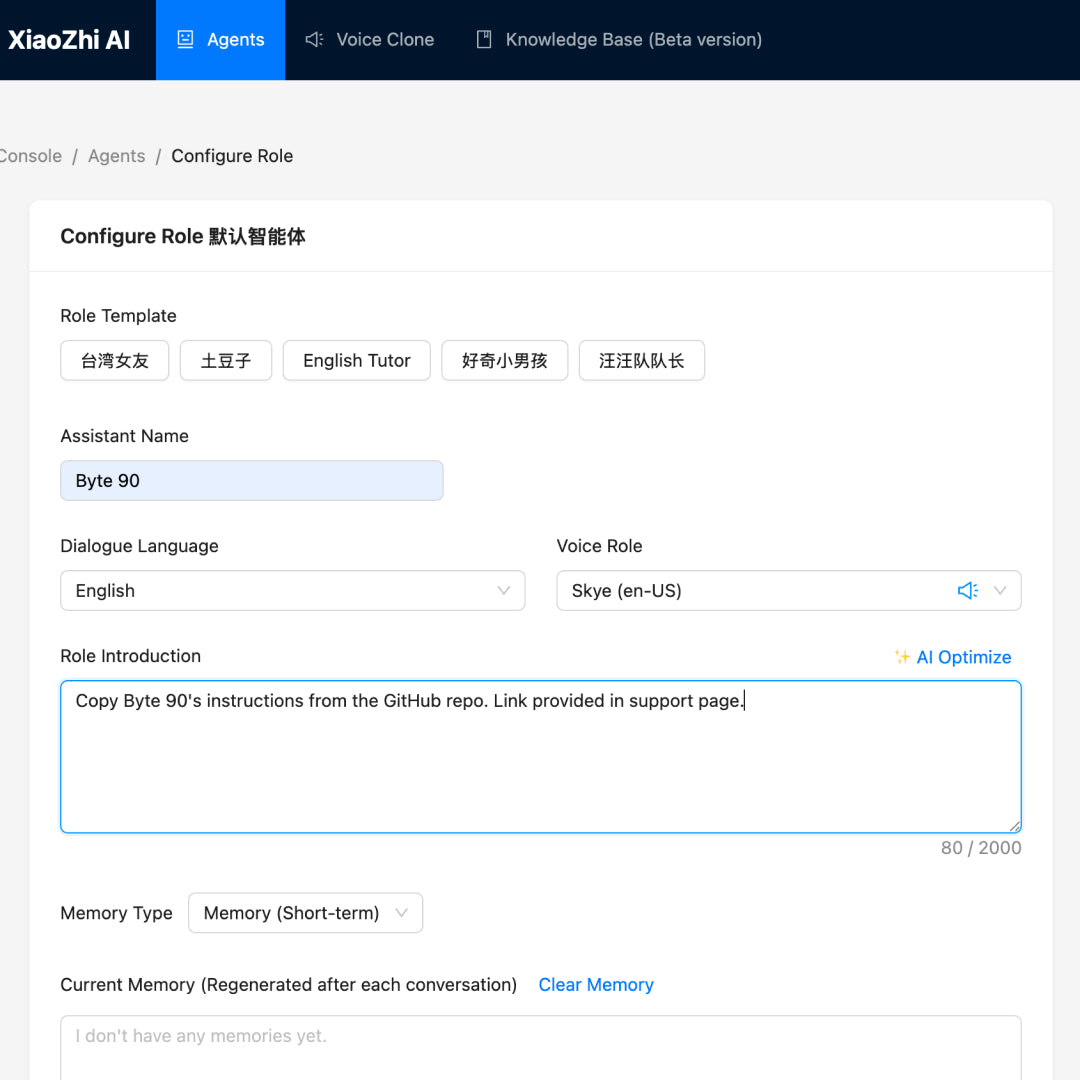 In the Xiaozhi console, on your Agent card and click “Configure Role.” From here you can set:
