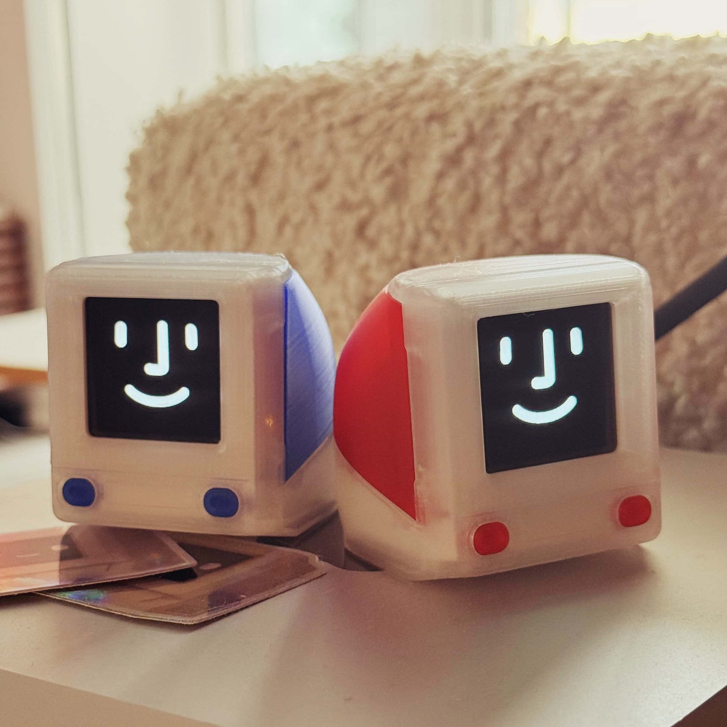 Both devices pair using ESP-NOW protocol to exchange data, coordinating their communication through expressive animations and sound. This creates a synchronized, interactive experience between the two units.